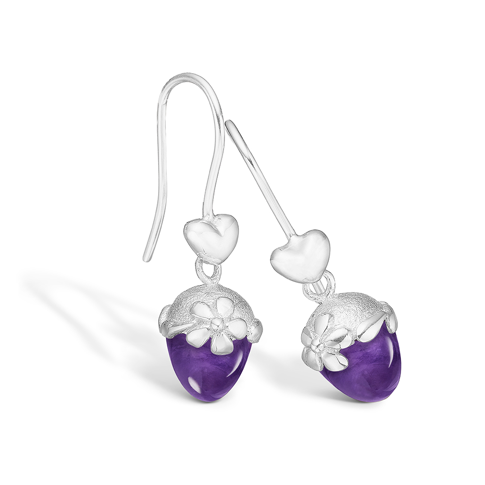 De flotte ørehængere er fra Blossom Copenhagen. Sølv ørehængerne er med blanke hjerter på bøjlen, hvor er under hænger en lilla ametyst dråbe.De flotte ørehængere er fra Blossom Copenhagen. Sølv ørehængerne er med blanke hjerter på bøjlen, hvor er under h